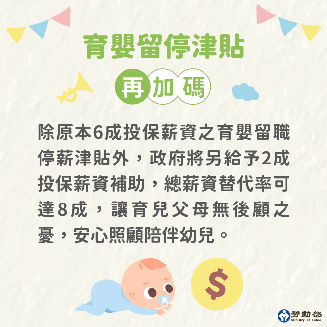 除原本6成就業保險投保薪資之育嬰留職停薪津貼外,政府將另給予2成投保薪資補助,總薪資替代率可達8成,讓育兒父母無後顧之憂,安心照顧陪伴幼兒。