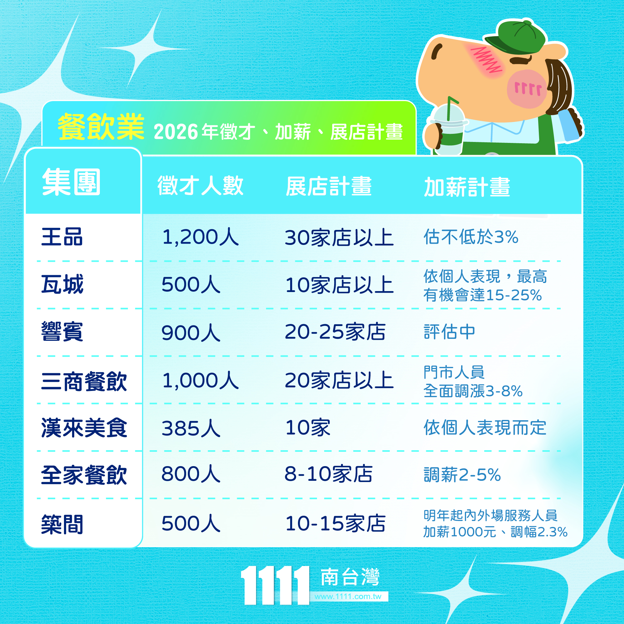 - 三商餐飲:主打日常剛需,明年展店 20家以上,大舉徵才 1,000人。更宣布自明年1月起,門市人員全面調薪 3%~8%。
