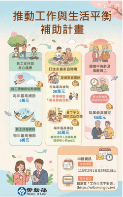 為鼓勵企業營造友善家庭職場,推動工作與生活平衡措施,勞動部115年度「推動工作與生活平衡補助計畫」2月1日起受理申請,申請期限至5月31日止,籲請企業把握時間踴躍提出申請。